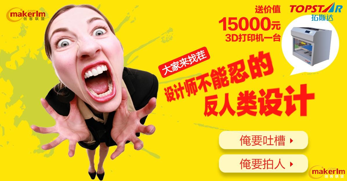 5.15日至5月31日,創客聯盟與上市公司拓斯達共同舉辦大家來找茬:設計師不能忍的反人類設計活動,贏取最終大獎價值1.5萬元的3D打印機一臺,同時每日選吐槽TOP1,免費3D打印另傳3D模型,一共15名,下面實況直播打印詳情,揭露打印細節。