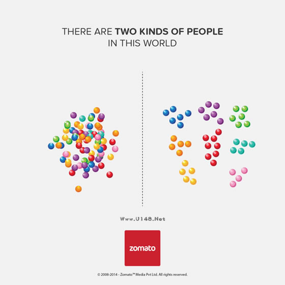 小編平時(shí)說(shuō)世上的人千差萬(wàn)別,針對(duì)不同的事物又有不同的喜好。但是Zomato公司分析了人們?cè)谑澄铩⒕筒托袨樯系钠茫瑓s發(fā)現(xiàn)了一個(gè)令人驚訝的事實(shí):世界上只有兩種人!隨后他們把這一結(jié)果用一張張插畫(huà)海報(bào)對(duì)比呈現(xiàn)了出來(lái)。小伙伴們快來(lái)對(duì)號(hào)入座吧。